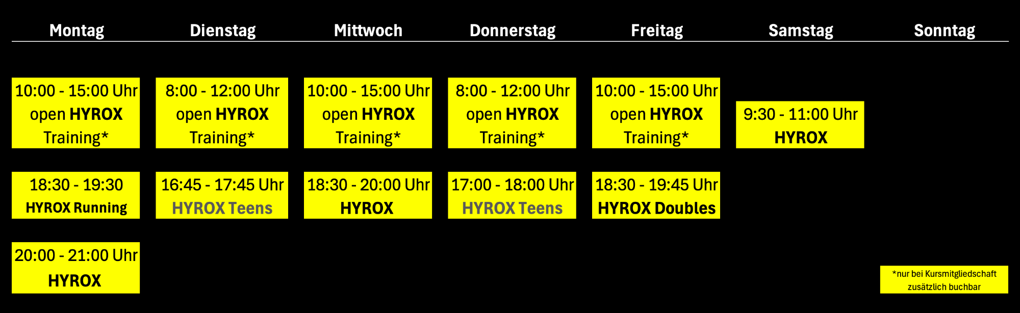Als zertifiziertes HYROX-Gym bieten wir dir ein Training auf Spitzenniveau. Unsere Trainer verfügen über die HYROX Level 1 Lizenz, die sie als Experten für funktionelles Training und Wettkampfvorbereitung auszeichnet. Ob du dich auf deinen ersten HYROX-Wettkampf vorbereitest oder deine Leistung verbessern möchtest – bei uns erhältst du die professionelle Betreuung, die du brauchst, um deine Bestform zu erreichen.